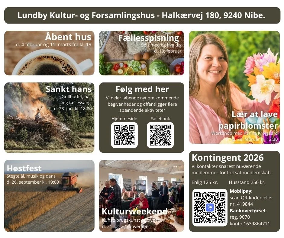 Vil du låne Lundby Kultur- og Forsamlingshus til en aktivitet for området i 2025, kan du låne vores hus gratis. Kontakt formanden på treumer1021@gmail.com.