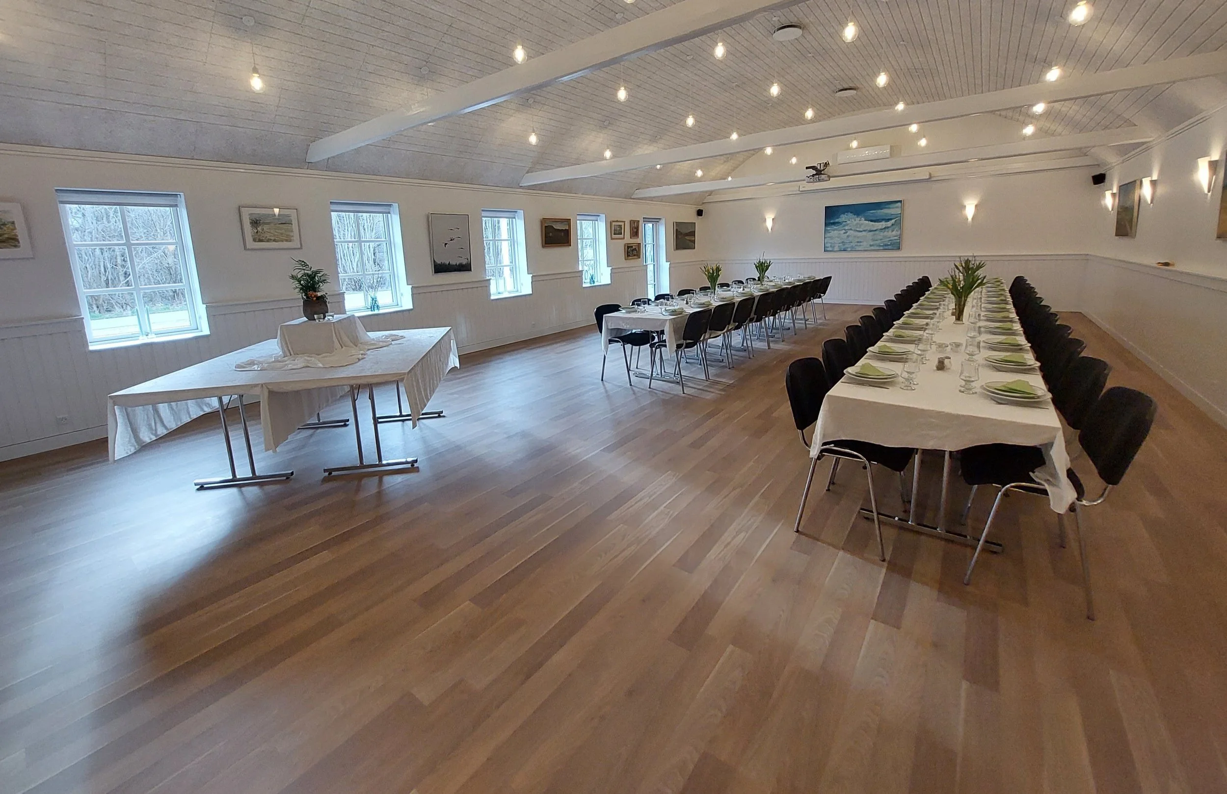 Salen har plads til 110 siddende gæster, er lys og indbydende. Salen har projektor, stort lærred og lydanlæg. I starten af 2023 blev vi færdige med en gennemgribende renovering af salen, der bl.a. omfattede nyt gulv, vægge, loft og lys.