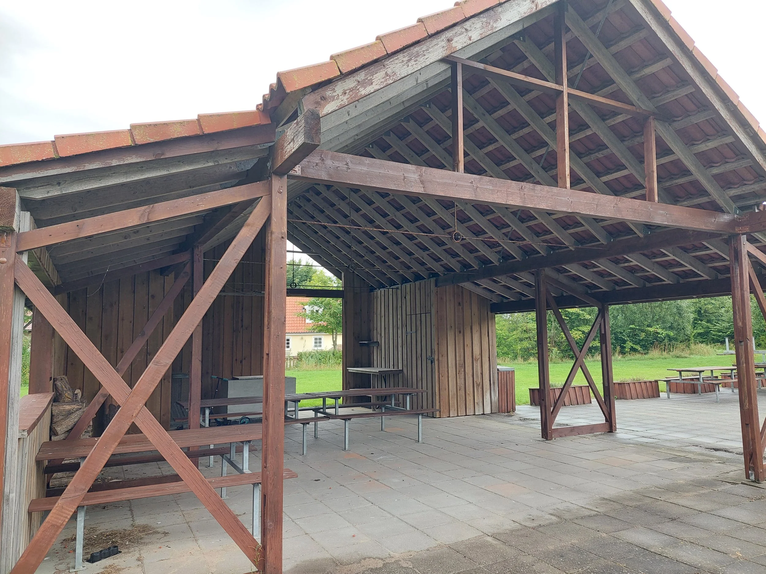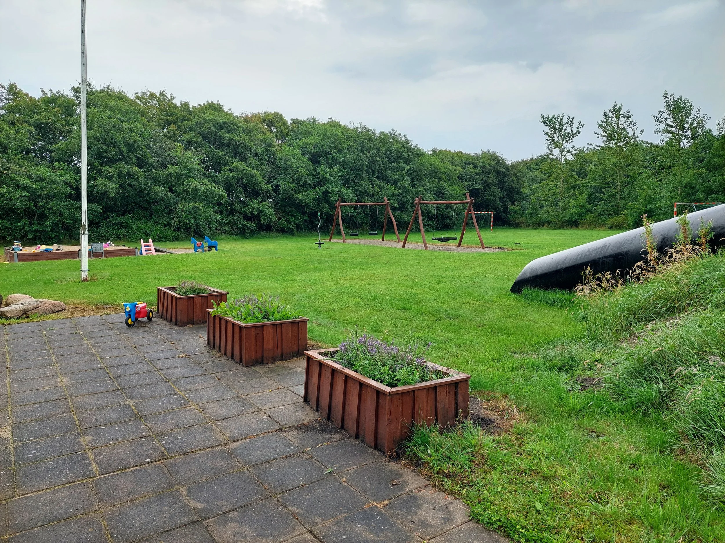 Foran huset er en stor grusbelagt parkeringsplads, bag huset er der overdækket terrasse til rygende gæster, et flisebelagt legeområde, og overfor huset ligger byens store legeplads med en træhytte.