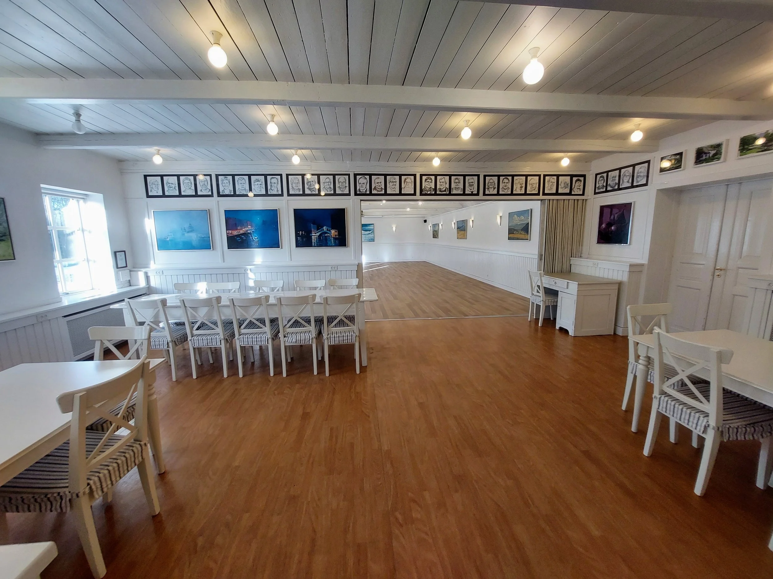 Salen har plads til 35 siddende gæster, er lys og indbydende. Udsmykningen er inspireret af Den Brøndumske Spisesal på Skagen Museum, vi udstiller værker af lokale kunstnere og øverst på væggen en frise med portrætter af nuværende og tidligere lokale borgere.