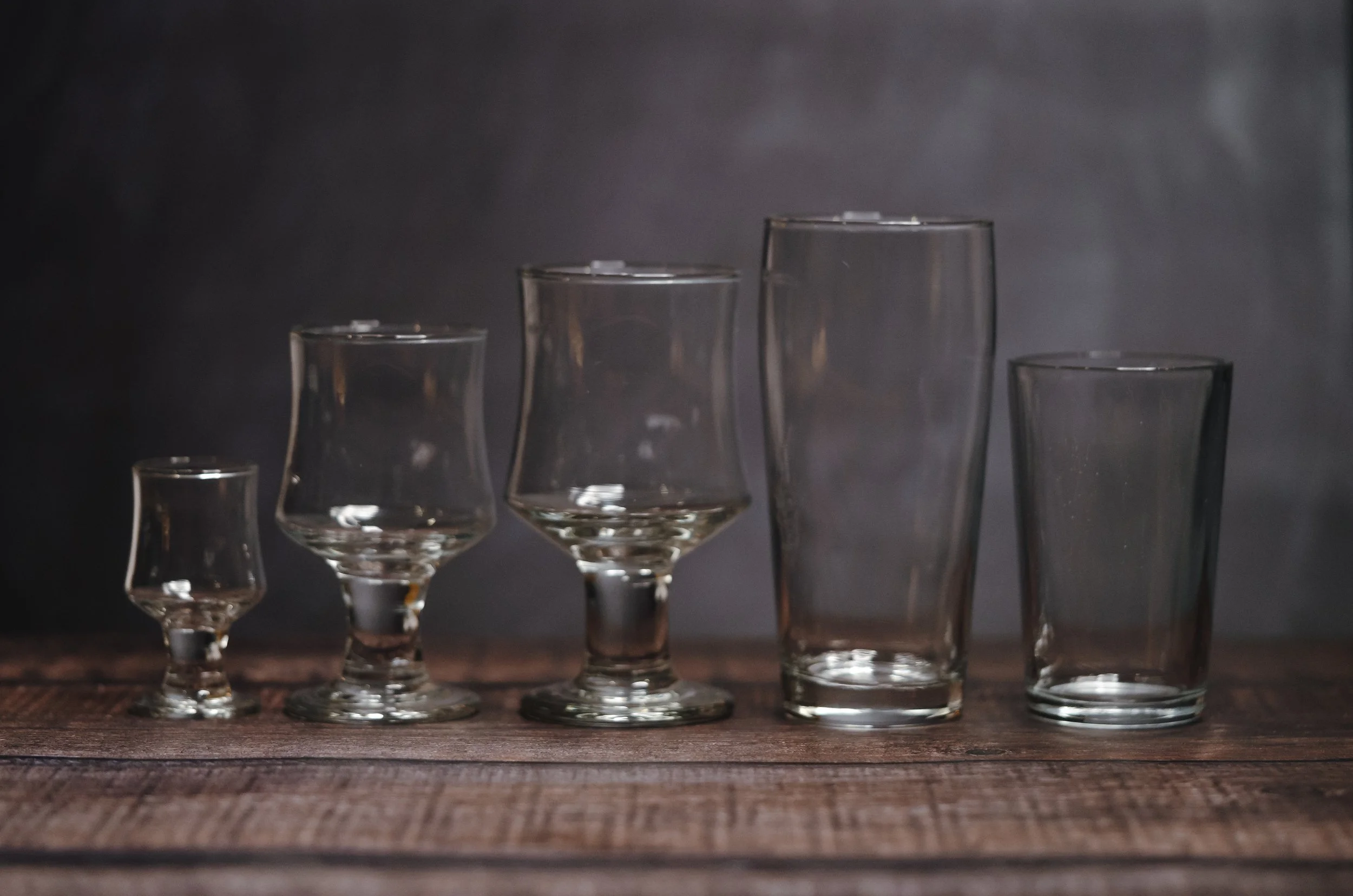 Vand-, øl-, rødvins-, hvidvins- og snapseglas.